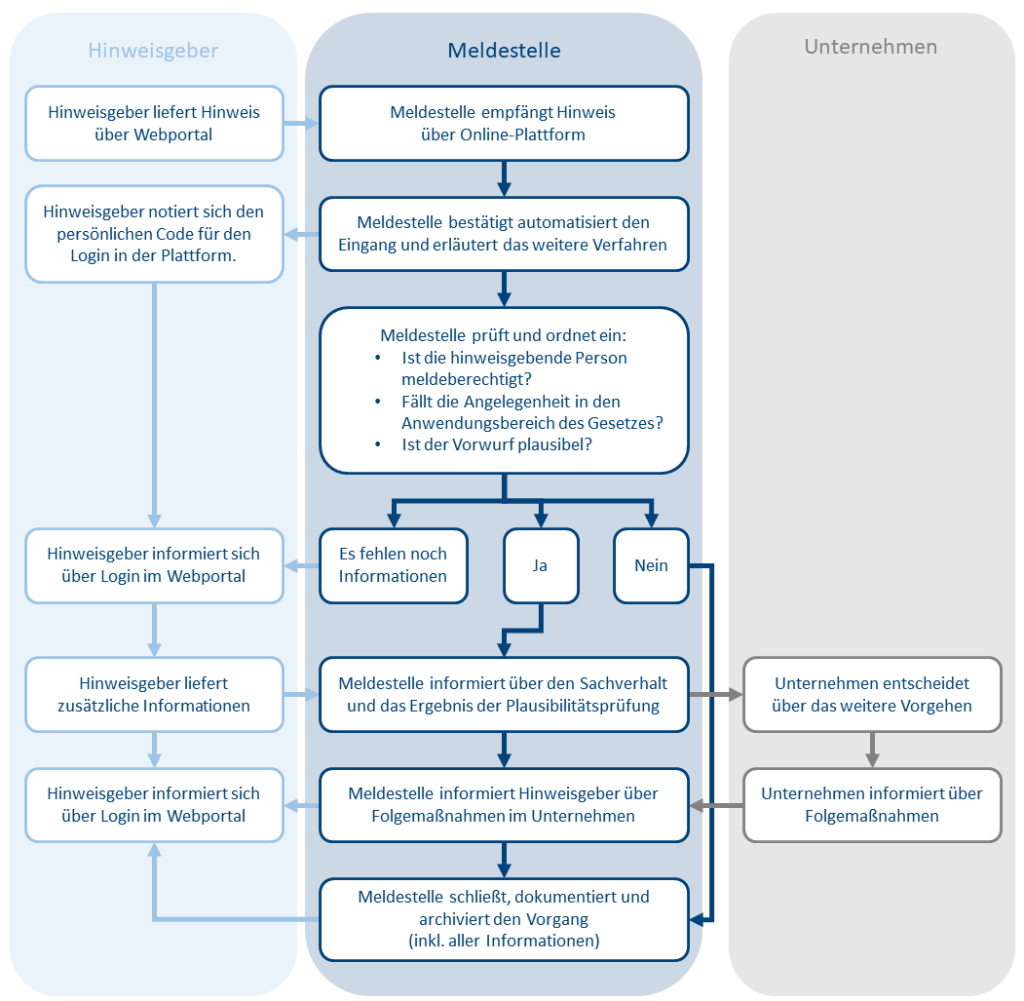 Prozessablauf Nachdem Sie Ihre Meldung abgegeben haben, wird diese automatisch an den Fallbearbeiter der Meldestelle gesendet. Wir prüfen, ob die Meldung in den Geltungsbereich des Hinweisgeberschutzgesetzes fällt und ob die Informationen reichen, um weitere Untersuchungen Weiterlesen